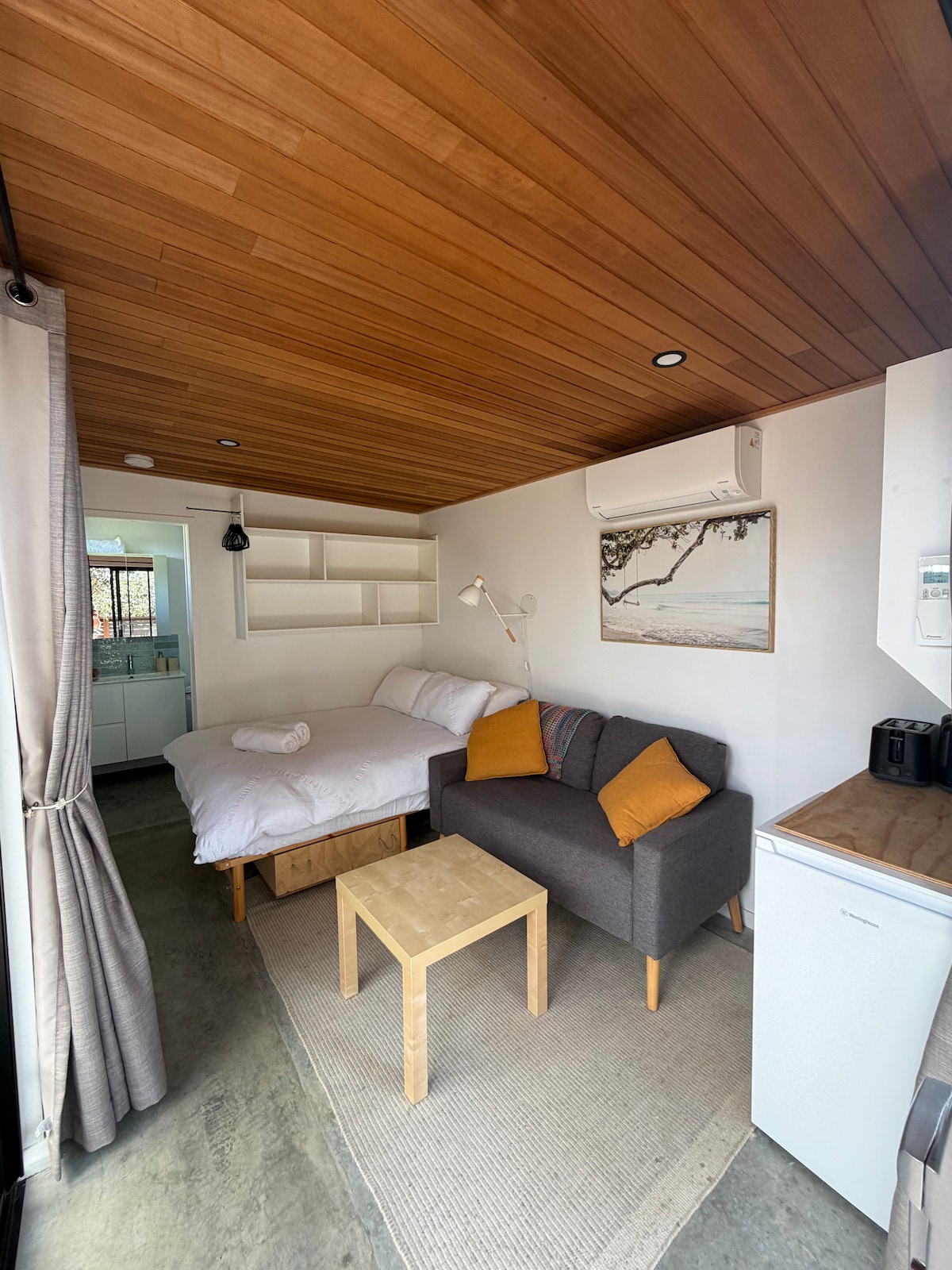 The Little Siren es un estudio independiente en la parte trasera de nuestra propiedad. Se encuentra en un pequeño y único bolsillo de Margaret River, con vistas a la zona de surf de Gas Bay y la cresta del cabo Leeuwin. Un oasis solo para adultos (no se admiten bebés, lo sentimos), en el que explorar el cabo, acurrucarse y leer libros o simplemente pasar la noche mirando las estrellas desde la cama. Nuestro dormitorio está en un nivel de entrepiso, el baño está abajo, ten en cuenta que hay varias escaleras en la propiedad.