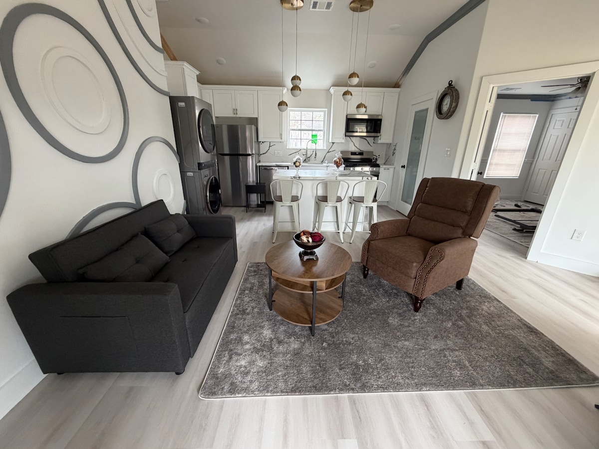Escápate a una colorida casa de huéspedes de inspiración parisina de mediados de siglo en el tranquilo y exuberante condado de Brazoria, a solo 18 millas del Centro Médico de Houston, a media milla de la ciudad de Pearland y a 30 millas de Kemah Boardwalk. Este elegante refugio ofrece el equilibrio perfecto entre el acceso a la ciudad y la calma del campo. Relájate en una cama tamaño queen y cocina en una cocina completa. Sal y da un paseo tranquilo hasta el pasto trasero o por la tranquila carretera rural, ideal para paseos matutinos o relajarse por la noche.