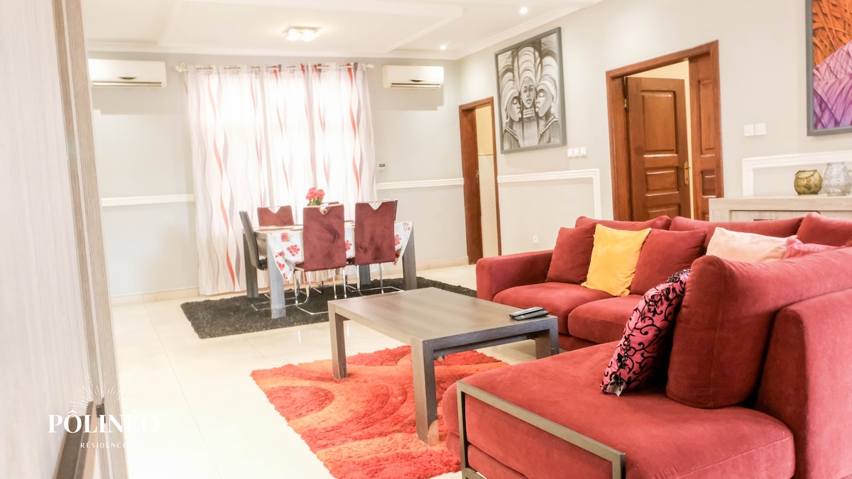 This elegant accommodation is perfect for stays in Kinshasa. With a bedroom featuring a modern bathroom, a guest toilet, a fully equipped kitchen, and a cozy living room, our suite offers all the comfort needed to relax. High-speed Wi-Fi, independent water and electricity backup, and 24/7 security are provided. For electricity, you pay for what you consume to the National Electricity Company. In case of a power outage, our back up system takes over.