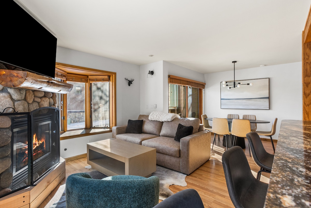 POR FAVOR, TEN EN CUENTA QUE: Complejo de piscinas cerrado del 27 de abril a mediados de mayo de 2026 No se permite el check-in anticipado ni el check-out después de la hora establecida. Relájate en este espacio tranquilo y elegante. Nuestro cálido y acogedor condominio está ubicado en una zona tranquila pero conveniente muy cerca de los ascensores y la ciudad. Acurrúcate hasta la chimenea de gas, relájate en la terraza cubierta y las sillas Adirondak con café o un coctel. Utiliza las batas proporcionadas para dar un paseo fácil hasta la piscina y las bañeras de hidromasaje después de un día de esquí o senderismo. El lujo de montaña se encuentra a solo un clic de distancia.