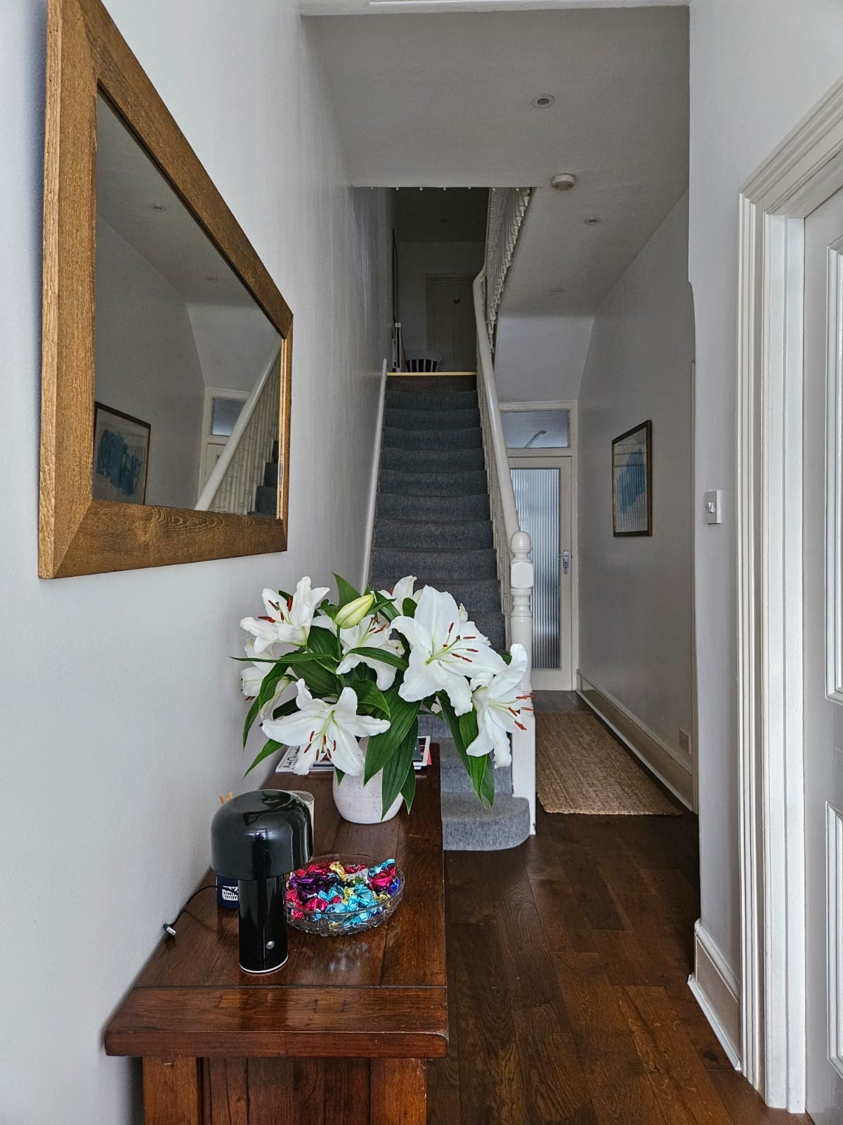 Habitación doble grande en casa victoriana con terraza. Primer piso, vista al jardín, a 8 minutos de la estación de Cricklewood, a 1 minuto de 10 paradas de autobús, a 2 minutos de la calle principal. La habitación está en una casa familiar amable y tranquila (músico, maestro, niño de 9 años). Ten en cuenta que esta habitación tiene baño compartido y que tenemos un gatito en casa.