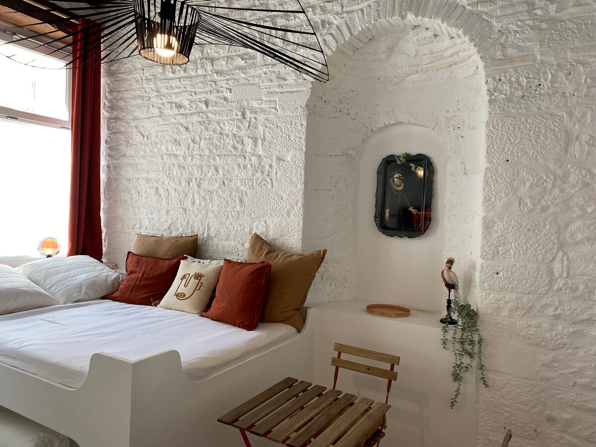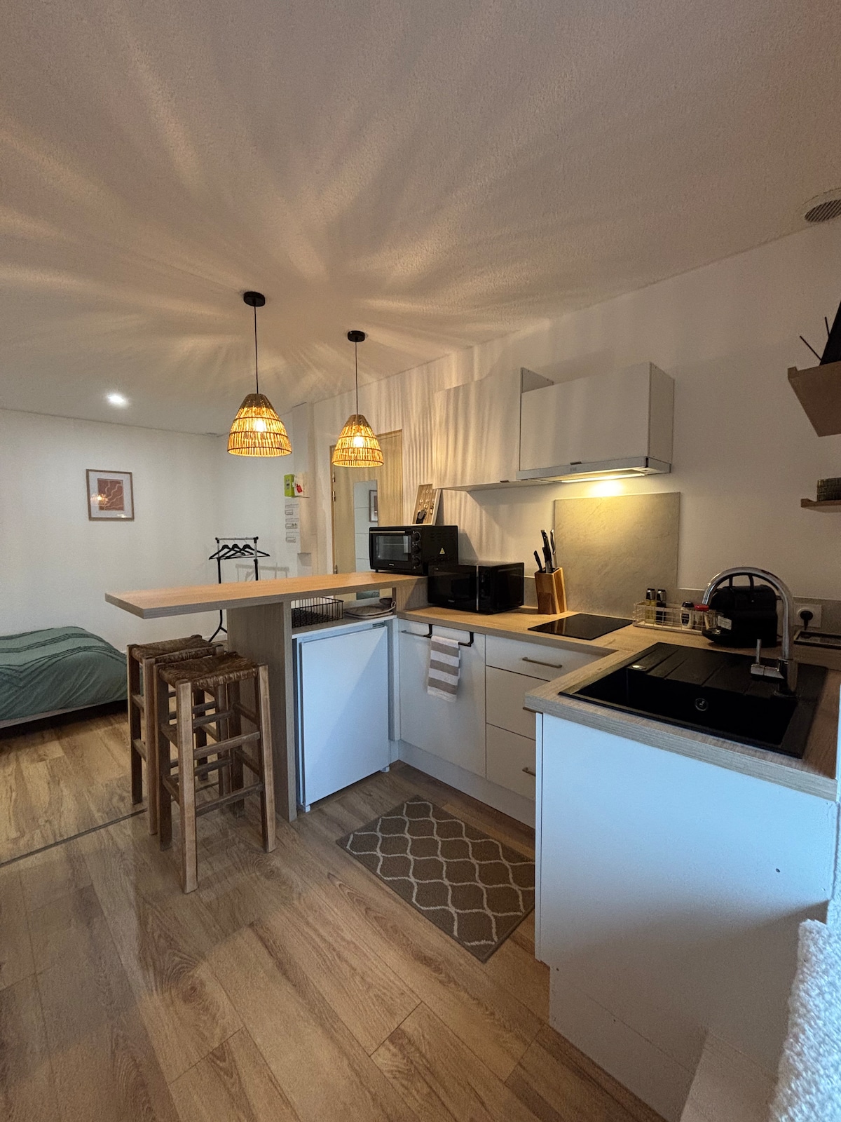 En pleno centro histórico de Dole. Segunda planta (sin ascensor), tranquilo, cerca de tiendas, restaurantes y la estación de tren (a 10 minutos a pie). Aparcamiento gratuito cercano. Tiene capacidad para 2 personas. Consta de un baño con ducha e inodoro, una cocina equipada (microondas, cafetera, hervidor, tostadora, freidora de aire, lavadora, placa de inducción). Televisión, acceso a internet a través de fibra. La zona de noche:una cama doble (140×190 cm). Se proporcionan sábanas y toallas. Llegada autónoma.