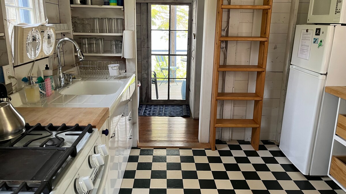 La histórica escuela de Brooklin se convirtió en la escapada perfecta de un dormitorio. Se encuentra enfrente del Brooklin Rockbound Capel, a 20 minutos en coche de Blue Hill. El Parque Nacional Acadia, el Bar Harbor o Bangor están a una hora de distancia. La construcción original de postes y vigas, con un ático para dormir, le da al interior un ambiente rústico compensado por la paleta de colores juguetones y el papel pintado de mariposas lo hacen más botánico y alegre.