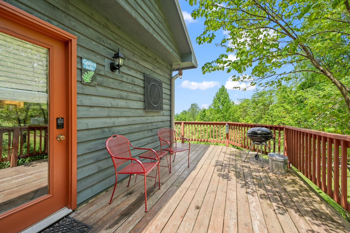 Amplio apartamento privado de 1350 pies cuadrados en una ubicación tranquila y arbolada, a 1 milla del centro de Nashville y del Parque Estatal del Condado de Brown. 3 camas tamaño queen (una es una cama plegable, para tener 2 áreas para dormir separadas). Cocina completa con lavadora/secadora. Wifi gratuito. Gran patio privado y terraza para observar aves con tu café y galletas de la mañana de cortesía. Disfruta de la parrilla de gas al aire libre y del pozo de fuego (se proporciona madera). O toma una copa de vino y relájate frente a la chimenea de gas de la sala de estar. ¡Disfruta!