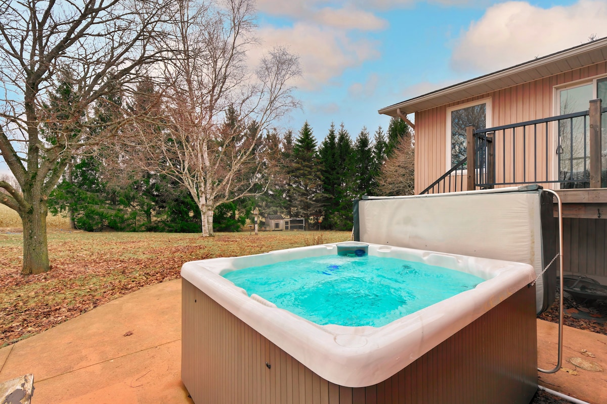 ¡El verano está en camino y es hora de pensar en una escapada relajante en la Tiny Honey House! Nuestra minicasa tiene una ubicación céntrica en la península de Bruce, cerca de la popular Sauble Beach, Tobermory y el Bruce Trail. Después de un día de aventuras, date un chapuzón en la piscina sobre el suelo o relájate en el jacuzzi. Hay una buena posibilidad de ver las auroras boreales mientras te sientas con tu bebida favorita alrededor de una fogata rugiente mirando el cielo nocturno.