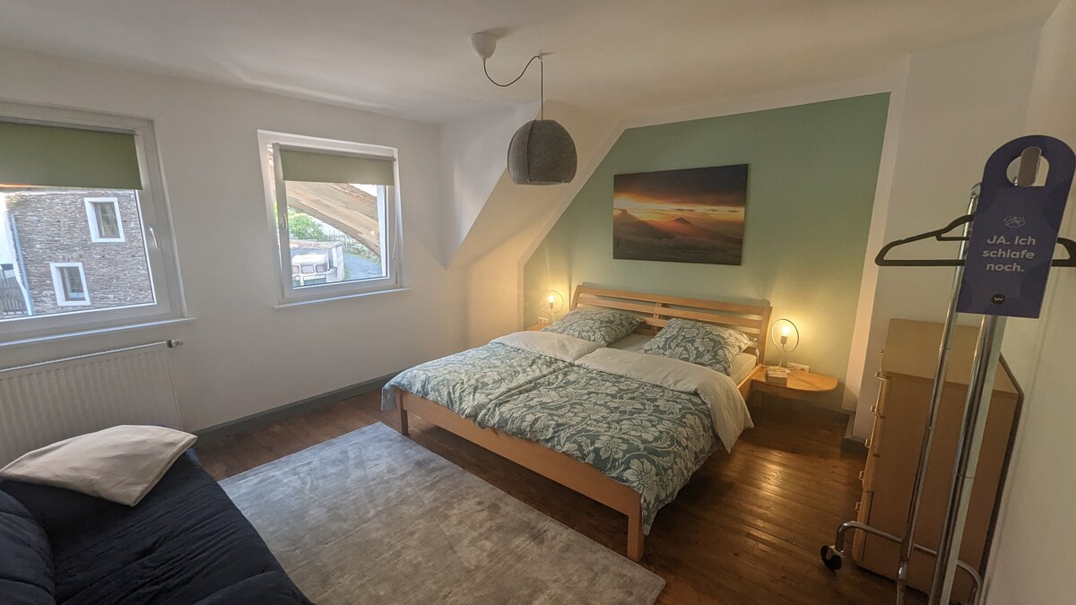 Spacious apartment with 2 bedrooms in a listed townhouse. Central yet quiet. 3 minutes from the train station - bus stop at the house. 5 minutes to the pedestrian zone. 30 minutes by car to the legendary Nürburgring. A family-friendly, uncomplicated atmosphere awaits you in a detached house. Ideal for couples, solo travelers, business travelers, & families. Free parking on the street.