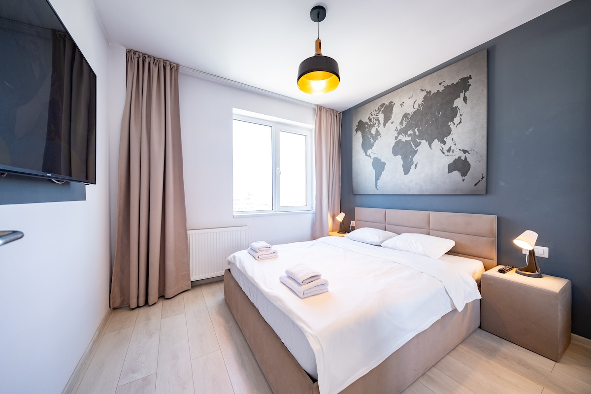 Despierta con vistas al balcón y relájate con un confort refinado. Esta elegante suite cuenta con televisor inteligente, cortinas opacas, WiFi rápido y aire acondicionado, perfecto para negocios o placer. Situado en el corazón de Bucarest, cerca de la plaza Unirii y el casco antiguo, es una escapada tranquila y elegante. ✨ ¿Todo listo para tu estadía en Bucarest? ¡Reserva ahora!