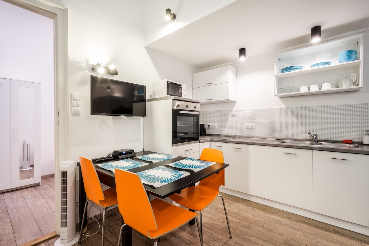 Apartamento de nueva construcción en la antigua fábrica de tarjetas Piatnik, en el distrito 7. El edificio se encuentra en el patio interior de la Universidad Metropolitana, por lo que se puede decir que es tranquilo a pesar de su céntrica ubicación. Es un entorno frecuentado, junto a la estación de tren de Keleti, a 2-5 minutos de las estaciones de metro, autobús, trolebús y tranvía. El distrito de fiesta y el parque de la ciudad están muy cerca a pie. También hay zonas comunes en el edificio, como un gimnasio y una lavandería. Equipado con aire acondicionado.