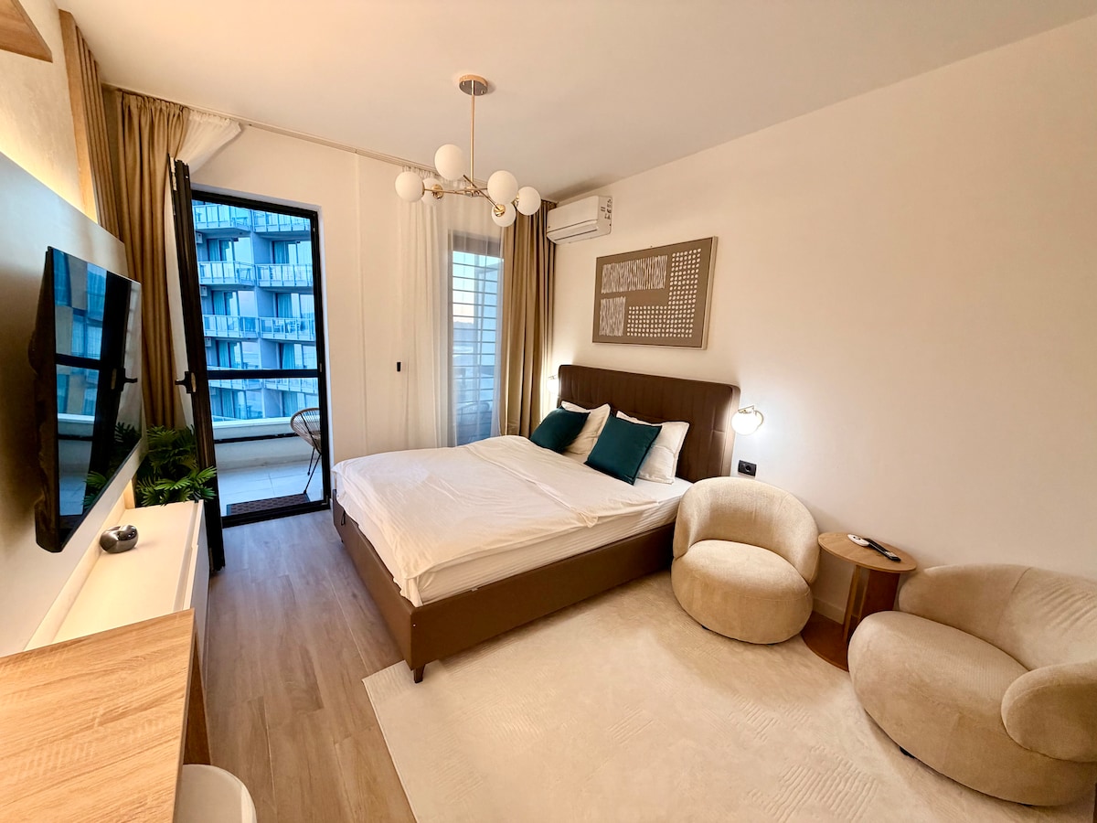 Moderno apartamento de 1 dormitorio (65 m2) para un máximo de 4 personas con vistas panorámicas al mar y acceso directo a la playa y al paseo marítimo de Budva/Becici. Completado en 2019, tiene 1 dormitorio con cama tamaño king, una cocina totalmente equipada, una sala de estar (el sofá se convierte en una cómoda cama doble), vestidor separado, baño. Aire acondicionado, casa inteligente, wi-fi, TV. Cuna y silla alta disponibles. Estacionamiento de pago en las inmediaciones. A poca distancia a pie del casco antiguo de Budva y la playa, restaurantes, supermercados.