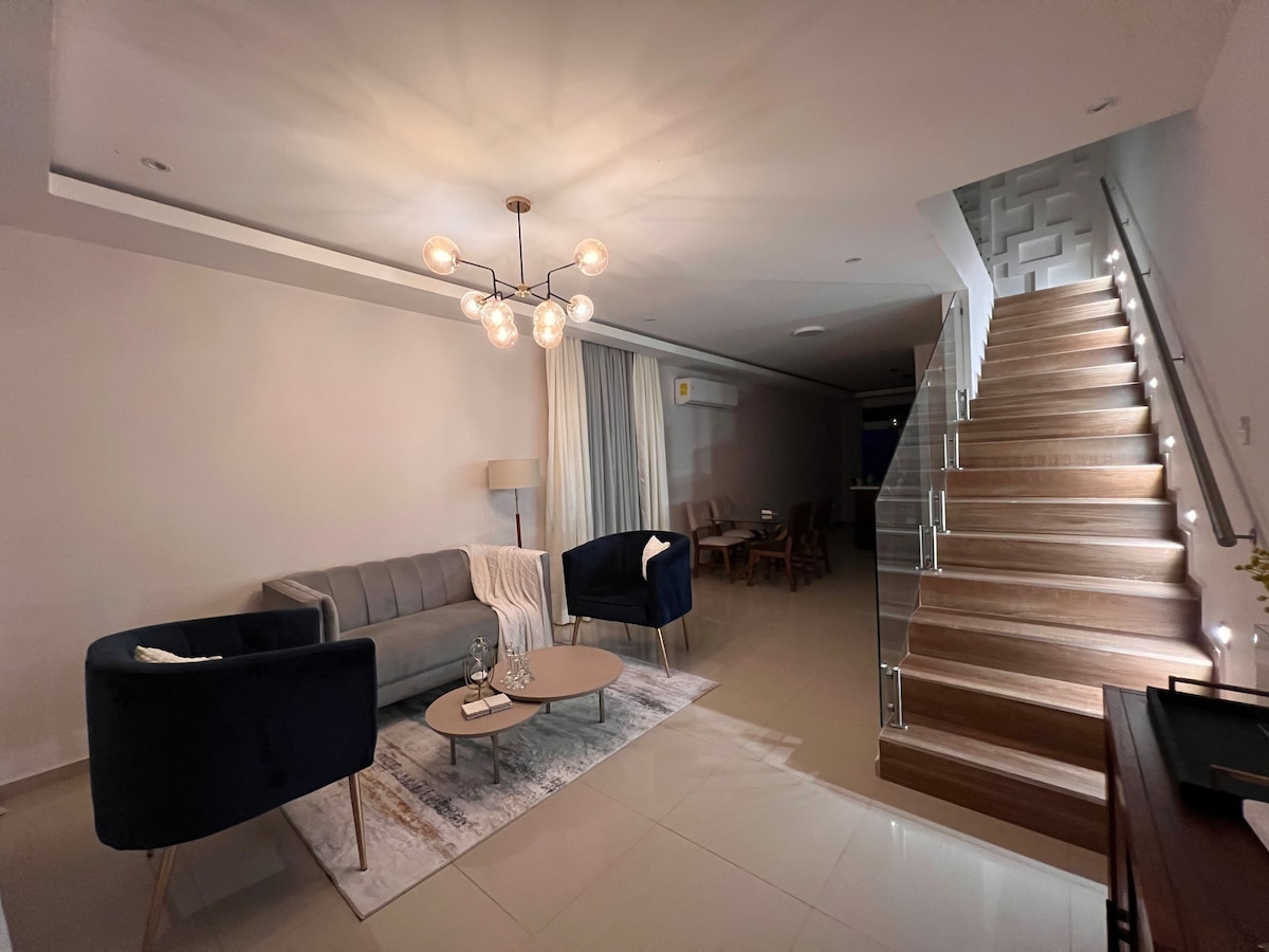 Apartamento en segunda planta con acceso autónomo. 🚙 1 traslado gratis al aeropuerto, llegando en 15 minutos aprox.. Cuidamos el planeta con paneles solares generando energía eléctrica. Ambiente seguro y familiar. Acceso a la residencial mediante código QR. Seguridad privada, muro perimetral. 🚙Baja tarifa de transporte local y nacional en camioneta si lo necesitas. 🚍Transporte público cerca A 5 minutos Despensa F, farmacia, expreso americano. 🚸 Acceso a área recreativa Visítanos