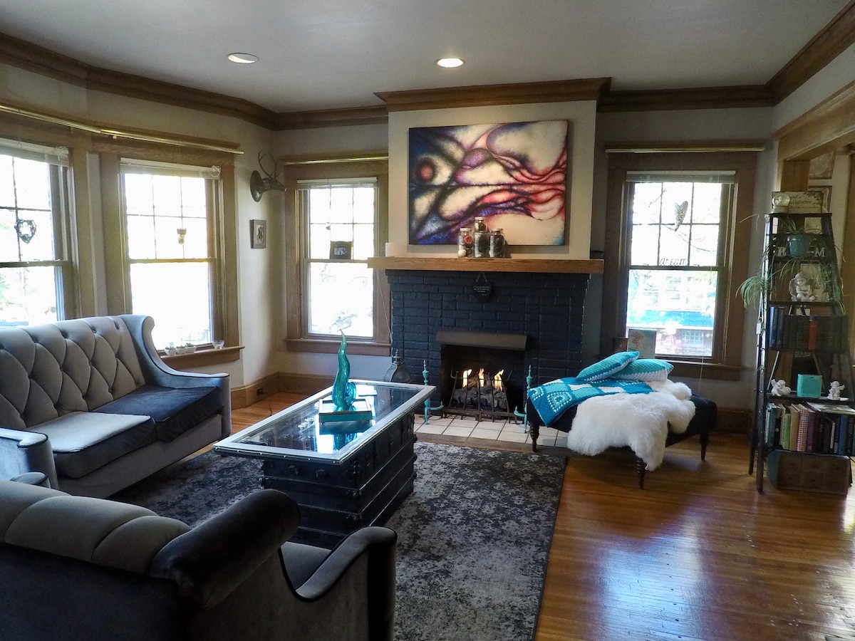 Disfruta de todas las comodidades de casa en cada temporada en nuestra casa de 4 camas, 2 baños, 2200 pies cuadrados, con encanto histórico. Con impresionantes trabajos de carpintería centenarios, el diseño abierto incluye una cocina totalmente equipada, acogedoras áreas de estar y comedor, una tranquila sala zen, oficina, vestíbulo acogedor y un gran patio perfecto durante todo el año. Arriba, cuatro amplios dormitorios ofrecen un relajante refugio. A solo 7 minutos del centro de la ciudad y a 15 minutos del aeropuerto, eventos. Sé nuestro huésped y siéntete como en casa en cualquier época del año.