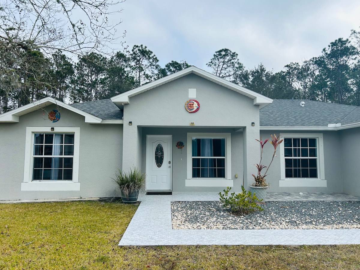 Relájate con la familia en esta casa privada entre pinos , a poca distancia en coche de la playa de Flagler. Estamos ubicados a 30 minutos de Daytona International Speedway y a 45 minutos de St. Agustín. ¿Tienes hambre? Las plazas comerciales y los restaurantes están a 5 minutos. Los aeropuertos internacionales de Orlando y Jacksonville están a menos de 1 hora y media de nosotros. Disfruta de increíbles restaurantes locales y exclusivos a lo largo de la orilla de Flagler Beach, así como de la proximidad a los lugares emblemáticos de San Agustín y las hermosas playas de Daytona