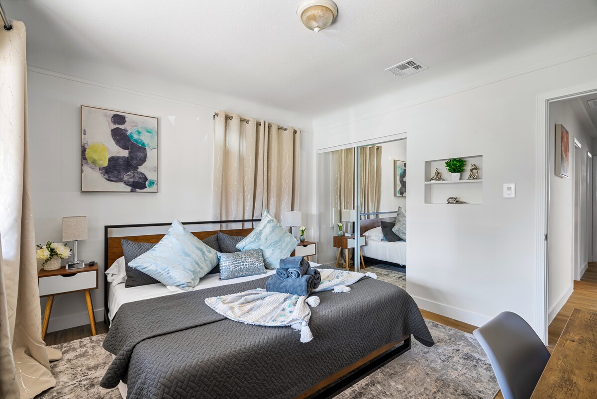 Moderna casa de 2 dormitorios/1 baño a minutos de Warner Bros., Universal Studios y el centro de Burbank. Disfruta de una espaciosa sala de estar con cómodos asientos y televisor inteligente de 55 pulgadas, una cocina completa con electrodomésticos de acero inoxidable y comedor, y un patio tranquilo. Duerme profundamente en dos dormitorios tamaño queen con sábanas de primera calidad. Tendrás Wi-Fi rápido, espacio de trabajo dedicado, lavadora/secadora, aire acondicionado central y estacionamiento gratuito en la calle. A poca distancia a pie de cafés, tiendas y estudios; a 10 minutos en auto de Hollywood.