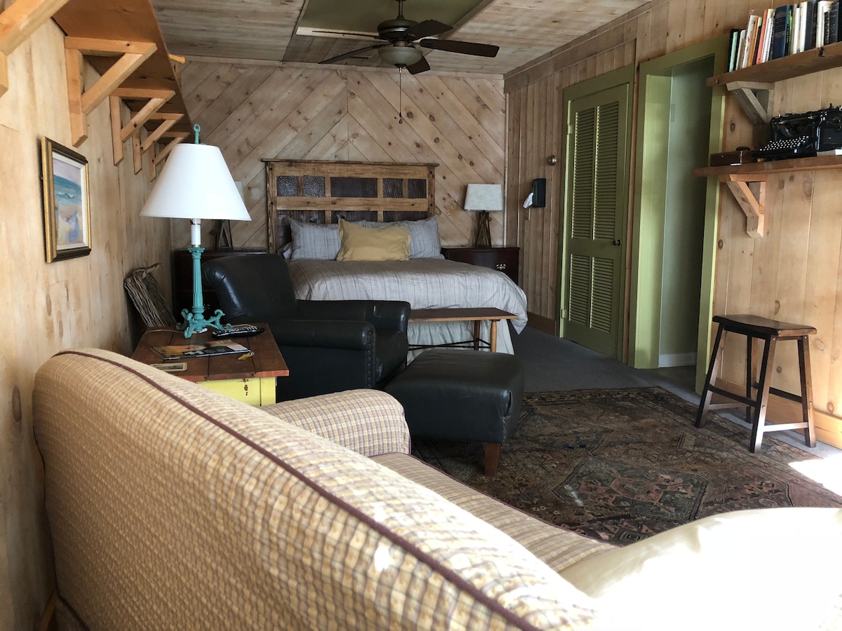 Una linda casa pequeña de estilo retro ubicada cerca de la ciudad, pero aún lejos de los sonidos de la civilización. Hay una pequeña nevera/congelador, microondas y una prensa francesa para el café, pero no una cocina completa. El barrio es muy seguro y limpio, ideal para dar largos paseos. ¡Hay una zona de fogata compartida con la casa principal que incluye hamacas para que puedas acostarte y ver las estrellas!
