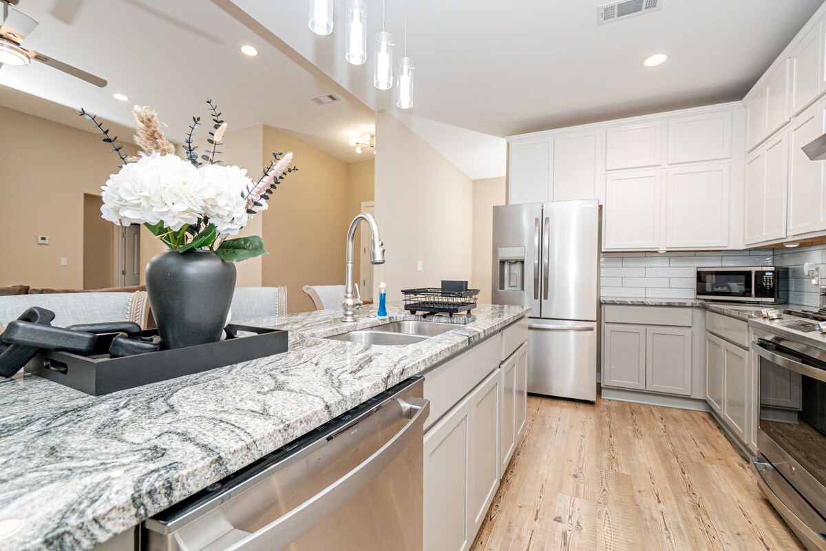 Esta espaciosa propiedad de nueva construcción ofrece comodidad elegante y moderna para cualquier viajero. Con suelos de madera en todas partes, la acogedora entrada fluye hacia un plano de planta abierta con una acogedora sala de estar y una cocina totalmente funcional, y el pasillo central conduce a un moderno baño entre dos dormitorios privados. La lavandería ubicada detrás de la cocina conduce a un gran patio trasero, un gran patio trasero y un camino pavimentado, todo rodeado por una valla de privacidad en una ubicación conveniente.