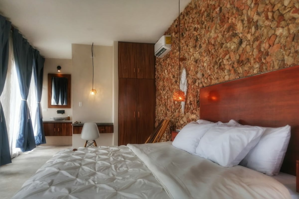 En esta pequeña crujía Sicté se ofrece una estancia para un descanso individual, de pareja o hasta 4 huéspedes y con todos los servicios necesarios, su mezzanine propone el aprovechamiento del espacio y valorar la doble altura de las casas coloniales. Se aprecia áreas que muestran la mampostería o pared de piedra caliza con lo que se estructuraban las casas antiguas. Cuenta con pequeña cocina, desayunador, recamara con cama matrimonial, baño y estancia de tv con un sofá cama tamaño matrimonial.