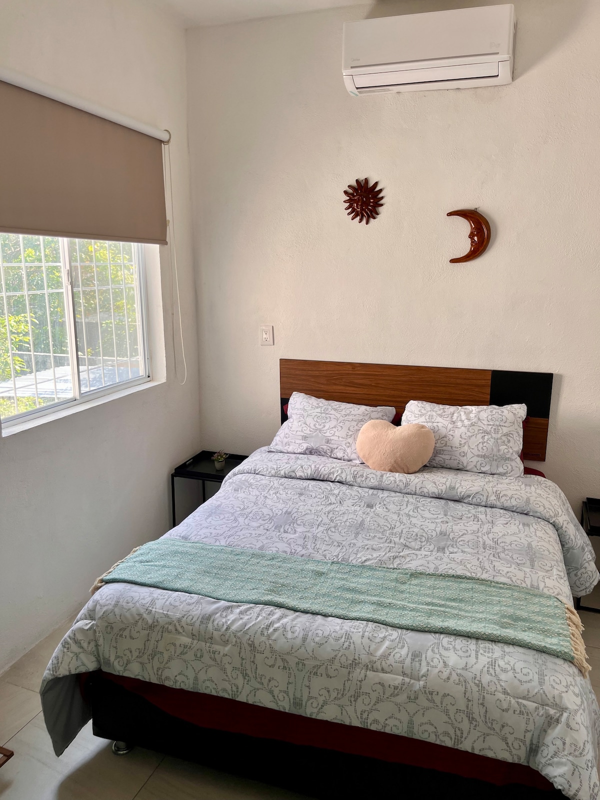 Departamento amplio cómodo con 1 habitación y 2 camas matrimoniales. En la cocina encontraras : parrilla de inducción, freidora, licuadoras, comedor para 4 personas, y una pequeña estancia trasera ideal para relajarse al atardecer o tomar un café por la mañana. La ubicación es excelente, ya que está cerca de supermercados, restaurantes, y transporte público. Sin duda, este departamento es una opción perfecta para quienes buscan un lugar acogedor y bien equipado para su estancia.