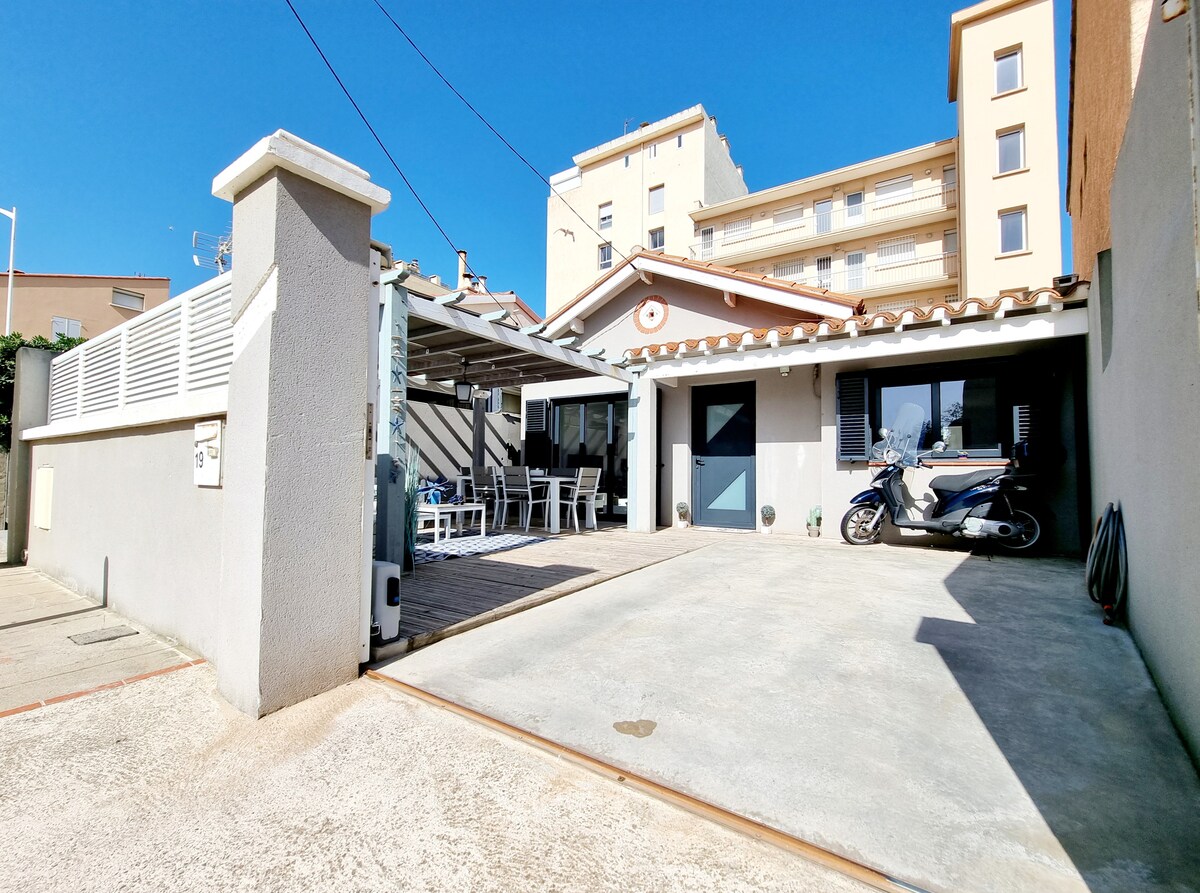 Casa refinada de 4 estrellas a pocos pasos de la playa, boutiques y restaurantes. Disfrute de una sala luminosa, patio tranquilo, terraza soleada, cocina americana moderna, 2 habitaciones elegantes con aire acondicionado y armarios, baño con ducha a ras de suelo, WC separado, lavadero y dependencia exterior. Estacionamiento privado con puerta automática. Experimente el lujo discreto del Mediterráneo.