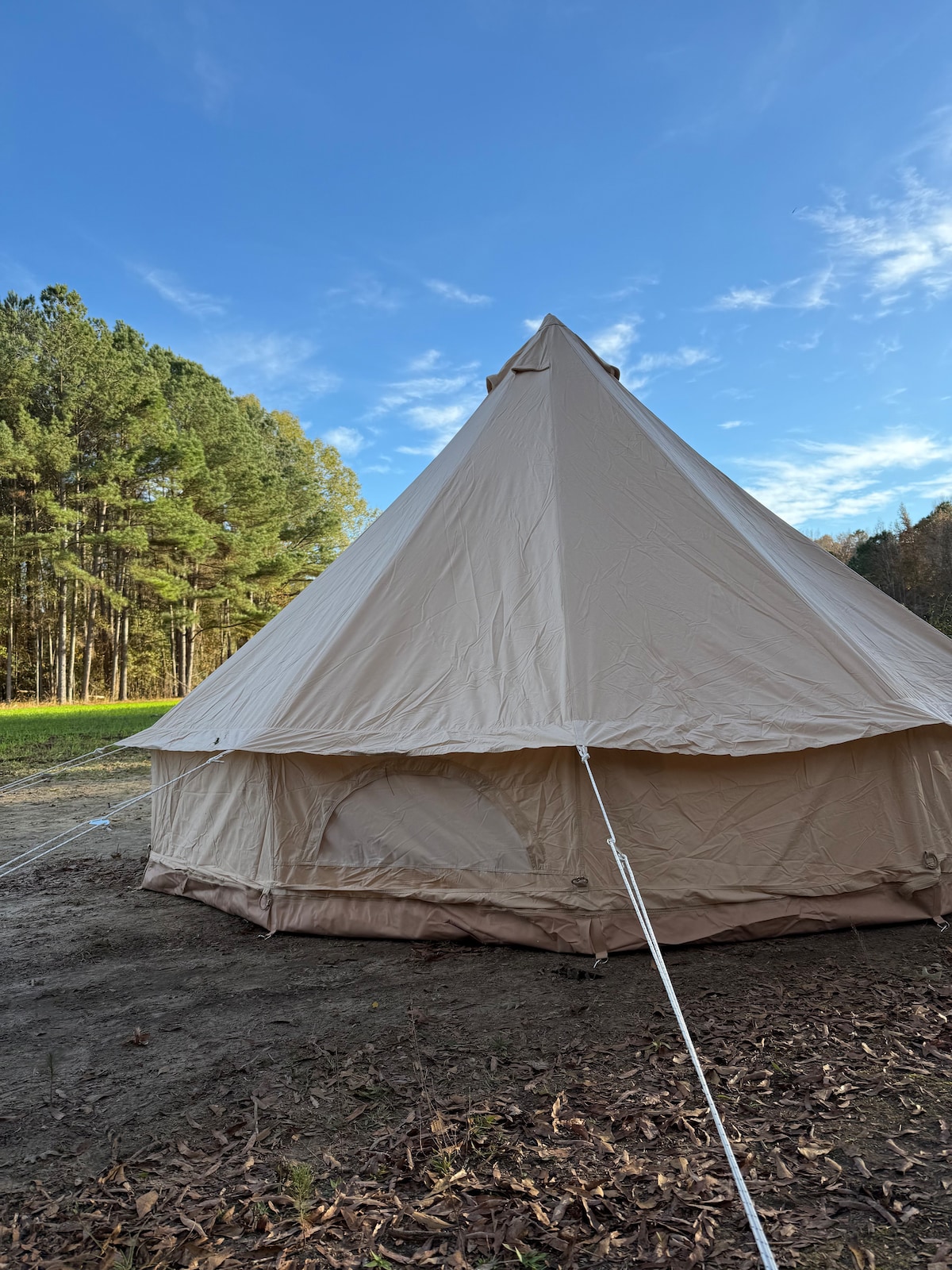Ofrecemos esta gran tienda de campaña de 12x16 con electricidad. Es con una cama tamaño queen, juego de comedor, luces, microondas, nevera y mini horno. Trae sacos de dormir para personas adicionales. Hay un aire acondicionado portátil para el uso nocturno y del tiempo de sueño, pero probablemente no será genial durante los días calurosos, ya que se trata de una tienda de campaña. El baño tiene agua caliente ilimitada y es un edificio separado a unos 30 pies de la tienda de campaña. Estamos a solo 3 millas del océano. No se permite fumar en esta propiedad.