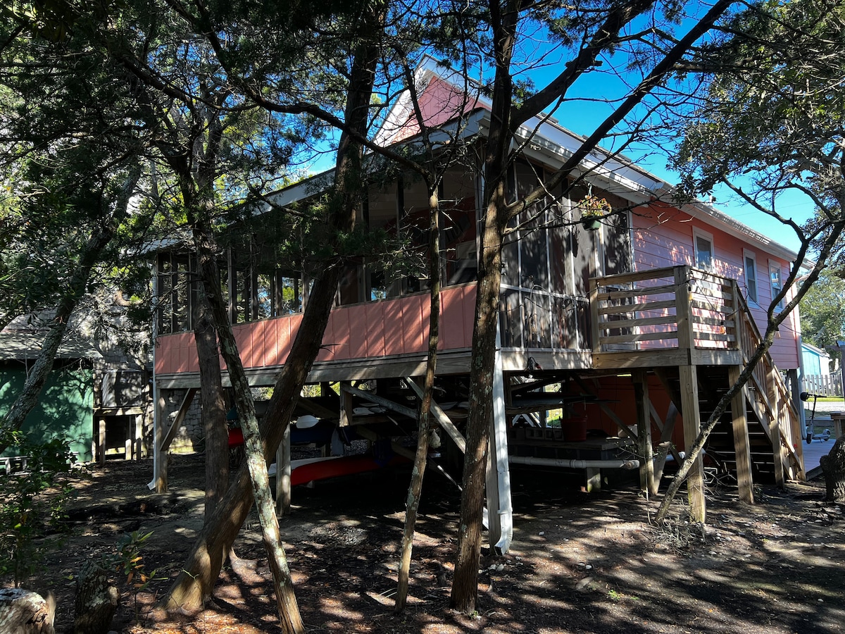 ¡🏝️🌞🐬 Desconecta de la rutina en esta casa de playa única y relajante ubicada en el bosque en el estrecho de Albemarle! ¡Esta joya oculta ofrece una combinación única de escapada rural y playa! La vida silvestre es realmente abundante en esta escapada romántica o vacaciones familiares: ver delfines, nutrias, tortugas, etc. ¡Disfruta de 3 acogedoras habitaciones, un nuevo jacuzzi, muelle privado, kayaks y un balcón personal en cada habitación con vistas increíbles! Convenientemente ubicada entre el centro de la ciudad de Elizabeth y los Bancos Externos. ¡Te esperan relajación y serenidad!🌊🏖️☀️