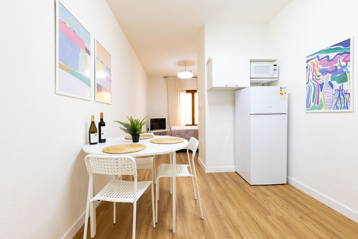 Apartamento compuesto por dos estudios conectados, separados por una puerta con llave. Para 1–3 personas se habilita el estudio principal (indicado como dormitorio 1) con cocina y baño privado. A partir de 4 huéspedes se abre también el segundo estudio (dormitorio 2), que cuenta con baño propio. Ambos disponen de aire acondicionado y WiFi. El edificio tiene ascensor. Ubicado en Lorca centro, a 15 min del Castillo y a 4 min de Plaza de España. Parking público a solo 2 minutos andando
