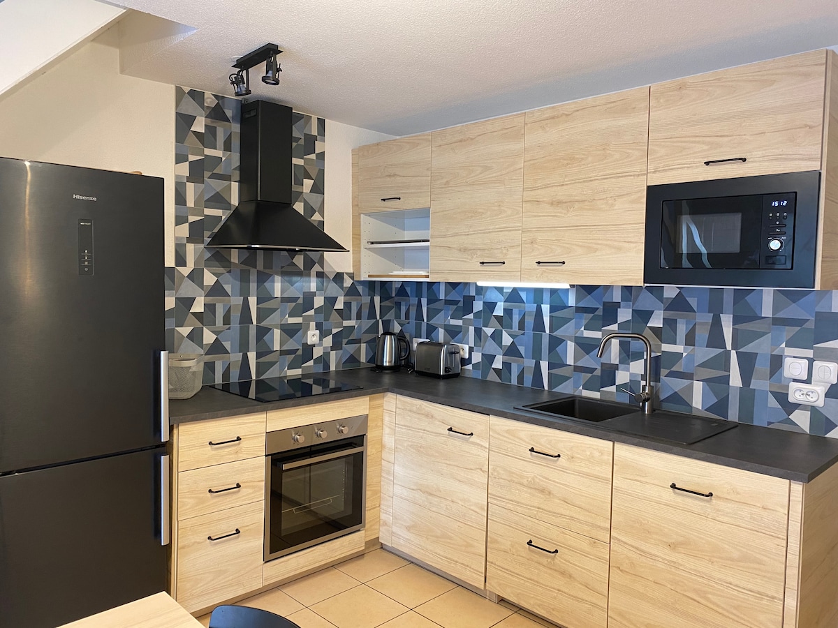 Tómese un descanso y relájese en este tranquilo oasis. Con ropa de baño y camas hechas. T2 de 40 m2 con terraza orientada al sur de 25 m2. 1 dormitorio cama 140/190 para 2 personas. con tv. 1 sala de estar con sofá para 1 cama. 1 cama en la entrada cama 90/190 para 1 persona. Cocina equipo y tv.. Nevera,congelador. Placa vitrocerámica,mini horno, microondas,aire fryer lavadora. TV, cafetera de filtros, Tassimo ...