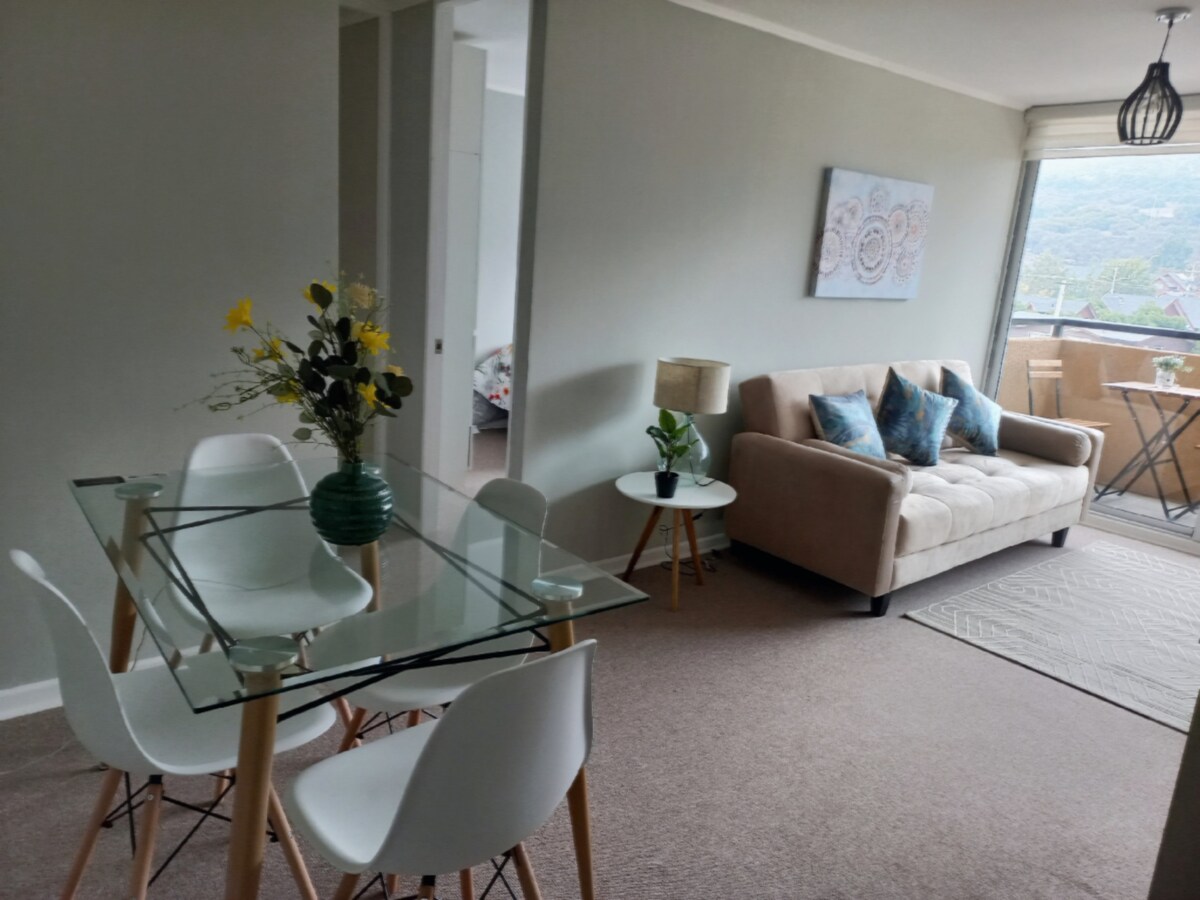 Tu familia estará cerca de todo en este alojamiento céntrico. Departamento luminoso con vista a la cordillera, ideal para tres personas. Cuenta con cama de 2 plazas, sofá cama, baño y cocina equipada. Además, tiene TV, terraza y acceso a piscina, sala de estudio y más. A solo dos cuadras del supermercado, a minutos del centro comercial y a 50 min de la capital. ¡Perfecto para una estadía cómoda y conectada!