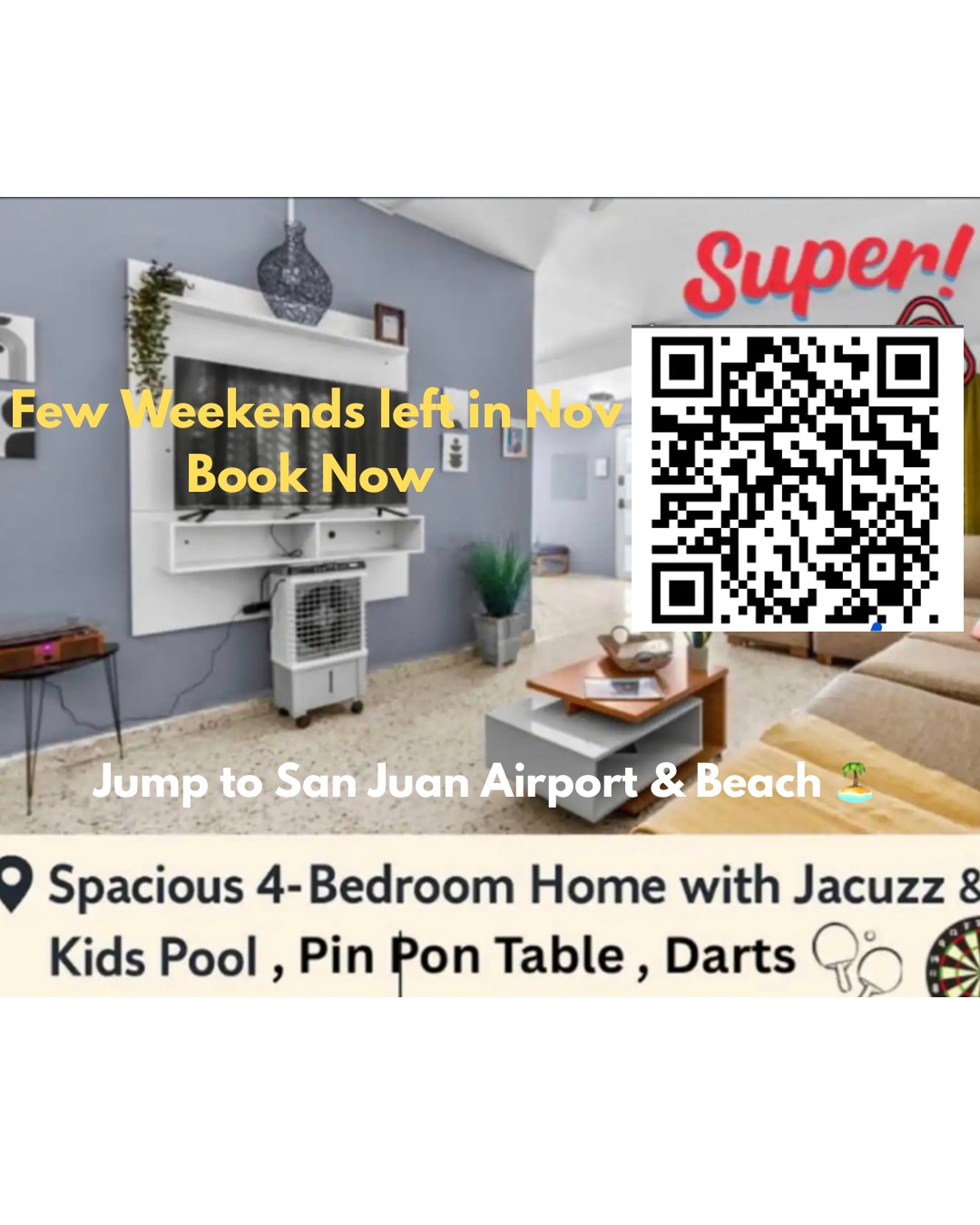 Hermosa residencia a 10 minutos de la playa de Isla Verde y del aeropuerto SJ. Propiedad con la mejor ubicación en PR. ¡Retiro soleado de 3HAB, 1BA en Isla Verde, Puerto Rico! A solo 10 minutos del aeropuerto SJU, esta casa totalmente equipada cuenta con cocina, comedor, piscina, garaje, mesa de billar y juegos para niños. Perfecto para familias o grupos que buscan diversión y comodidad. Cerca de playas, restaurantes y la vibrante vida nocturna de San Juan.