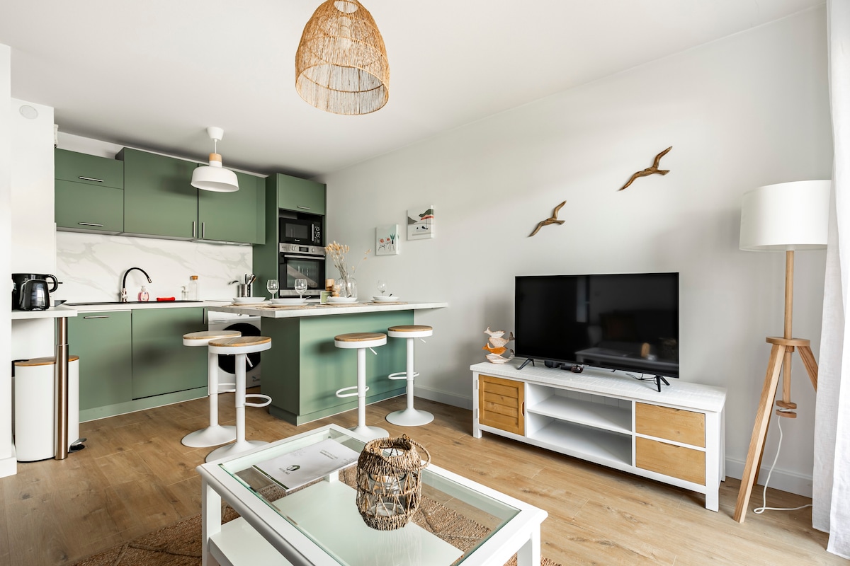 ¿Quieres descubrir la región de Burdeos con total intimidad? Escápese, a dúo, a este elegante apartamento de 37 m². Cuenta con: - una hermosa logia de 4 m² - una sala de estar relajante con sofá cama y TV (108 cm) - una habitación de cocooning con cama doble acogedora y TV (80 cm) - una cocina equipada - una lavadora y una secadora - Equipamiento para bebé El alojamiento fue renovado en 2023. Disfrute de un espacio de estacionamiento privado en un estacionamiento cubierto y seguro.