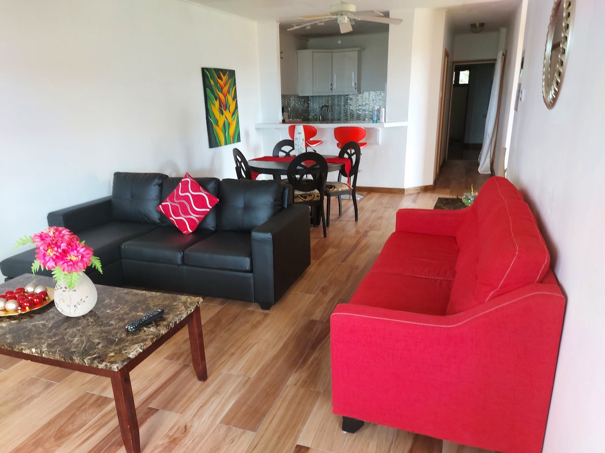 Vivimos en un barrio suburbano moderno y tranquilo con vecinos amables, flores bonitas y hermosas casas. Estarás encantado con la vista y el sonido de las aves y la vegetación verde. La propiedad es una estructura de hormigón con hermosos pisos de madera hechos de caoba local y mahoe azul con vista al mar Caribe. Se encuentra a 10 minutos de la ciudad y a 30 minutos de la zona principal de entretenimiento en autobús. Somos muy hospitalarios y esperamos poder ayudarte a tener una estancia fantástica.
