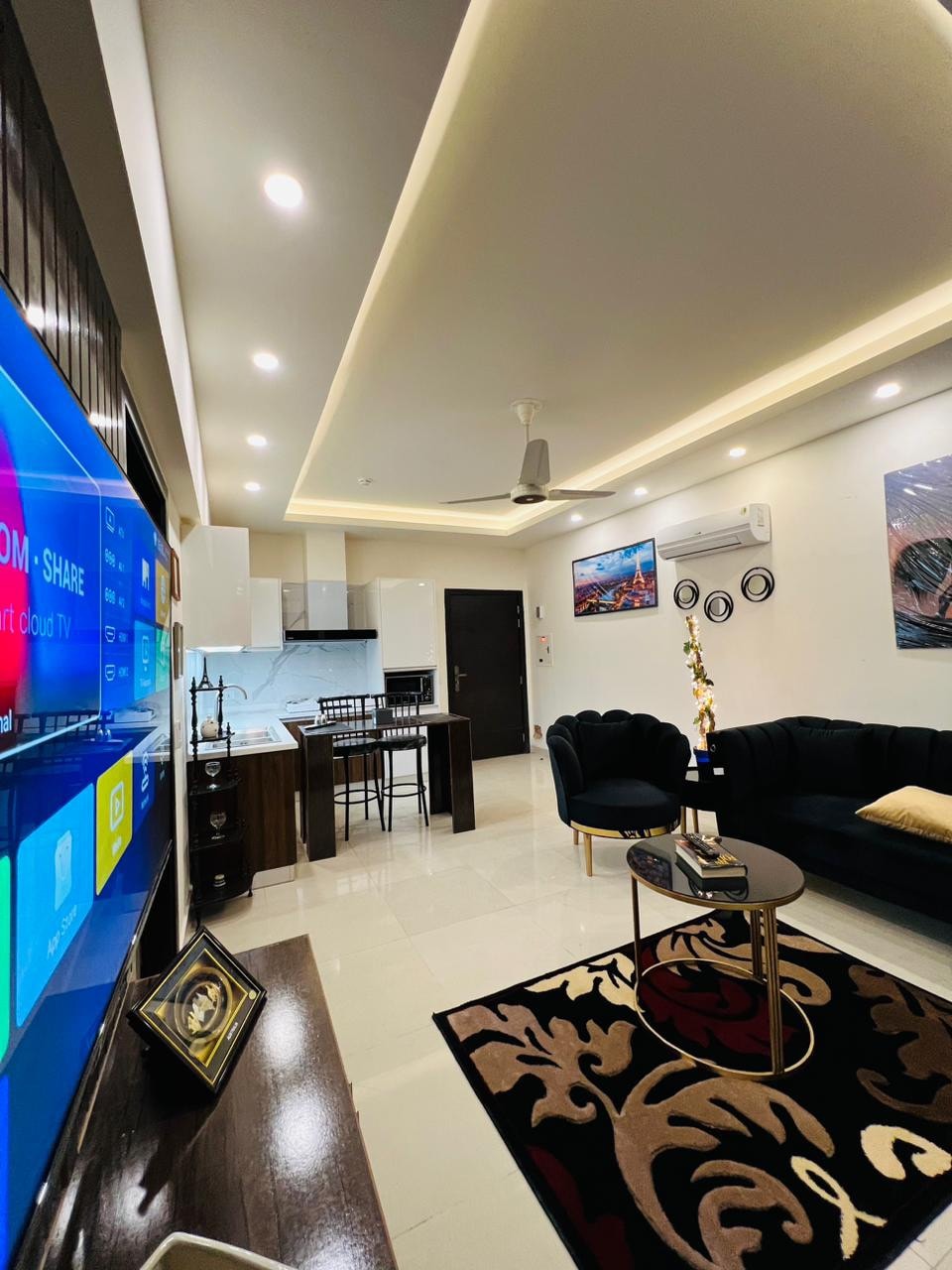 Entra en los apartamentos de 3 dormitorios de Flamingo Grand, los apartamentos con servicio más sofisticados y estéticamente emocionantes de Islamabad. Disfrute de una experiencia segura y con estilo en este lugar céntrico. Tanto si visitas Islamabad por placer como por trabajo, en Flamingo te aseguramos una experiencia de 5 estrellas. Los huéspedes también disfrutan de una plaza de aparcamiento gratuita y segura, wifi gratuito y la experiencia de ver sus series de televisión favoritas en el led inteligente de 65 pulgadas.