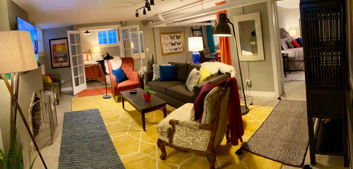 This unique place has a style all its own. Abstract artist Romelle is known for colorful, energetic work that explores the modalities of healing with color. This spacious studio comes equipped with a pillow top queen bed, kitchenette, and glass tiled en suite bathroom. Work from home with blazing internet speeds, or venture out to the many coffee shops, and restaurants steps from our door. Our central location provides the perfect launch pad to all of your travel and business needs in Denver.