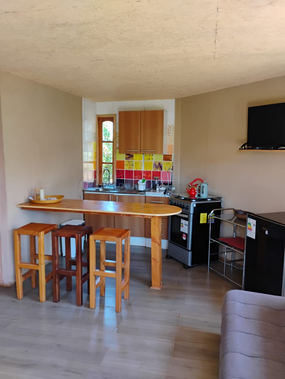 Nuestra acogedora cabaña posee un solo ambiente ,con cocina americana ,baño ,sillón futon, todo decorado con alegres colores y detalles creativos,posee buena iluminación y una hermosa vista del valle se encuentra a los pies de la cordillera y es el lugar ideal para descansar y disfrutar de la naturaleza. La cabaña tiene 1 ambiente. 1 cama matrimonial , además de futón de plaza y media.
