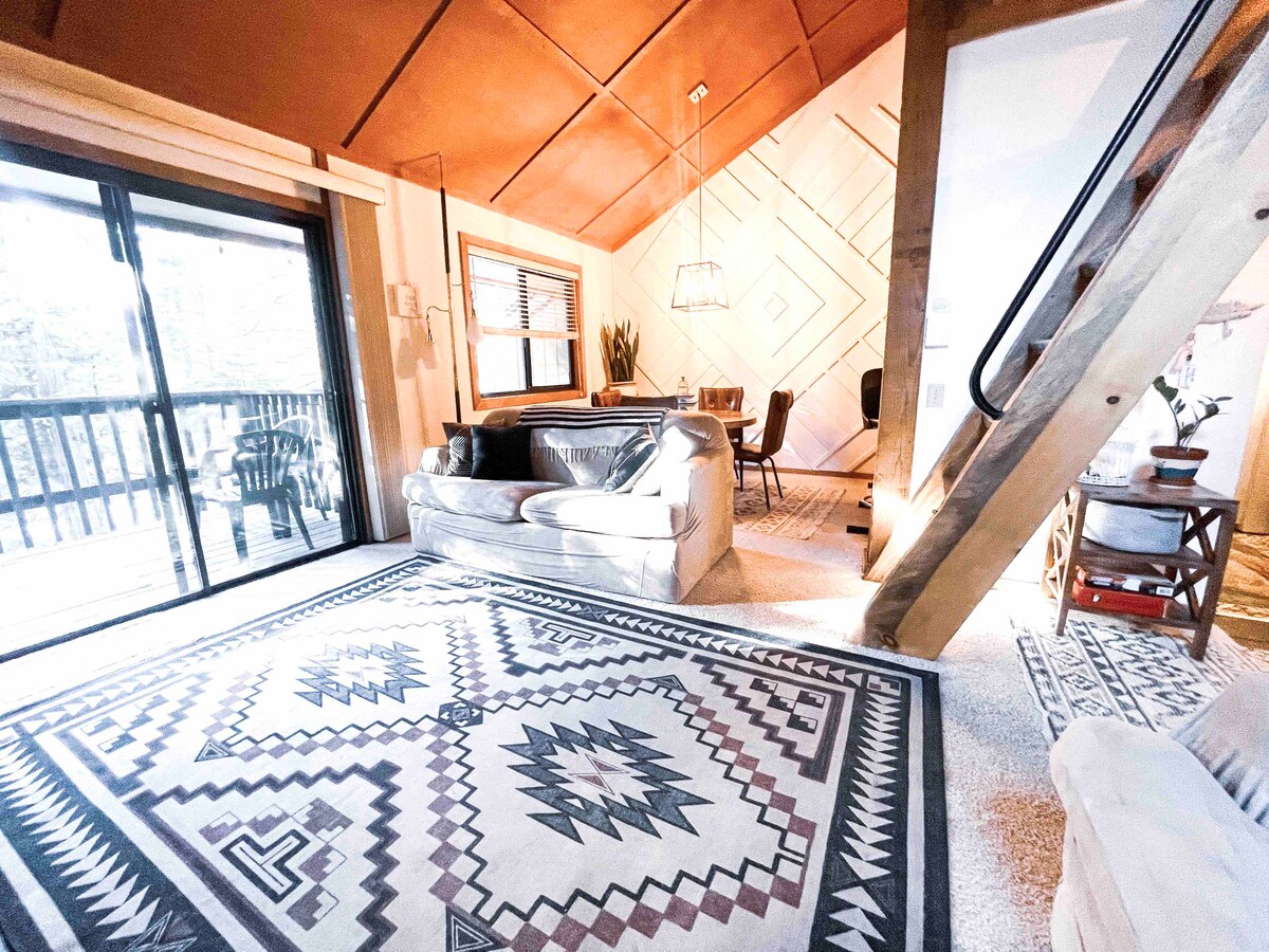 Relájate en este renovado condominio de Mammoth Lakes, camina a tiendas, restaurantes y senderos o toma el transporte a Mammoth Mountain. Perfecto para parejas o familias pequeñas, cuenta con techos abovedados, wifi rápido y acceso a una piscina climatizada, jacuzzi y sauna. “Todo estaba impecable, elegante y transitable, ¡una de las estancias más agradables que hemos tenido!” – Daniel 🌄 ASPECTOS MÁS DESTACADOS ✓ Camina hasta la ciudad, senderos y transporte de Mammoth ✓ Acceso a jacuzzi, piscina climatizada y sauna ✓ Wifi rápido + espacio de trabajo para estadías remotas