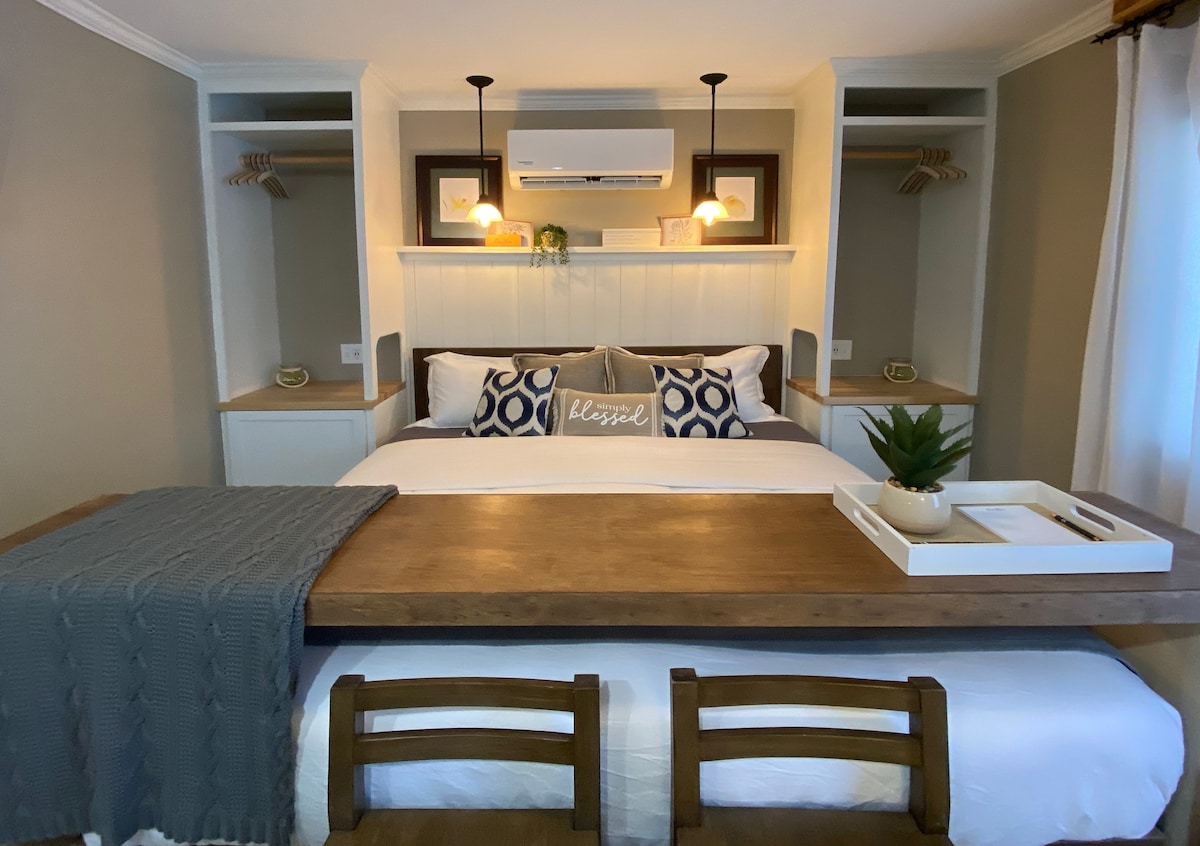 This is a converted 160 sq ft red barn shed with a covered front porch overlooking the beautiful grounds of St. Charles College. There is a Murphy Queen-sized bed, shower, antique sink, small refrigerator, microwave and coffee maker. Walls, bed frame and trim are crafted from palette wood, creating a crafted rustic look. We are within walking distance to restaurants and gift shops. It’s tucked in a historic, beautiful peaceful place where you can rest your mind and refresh your soul.