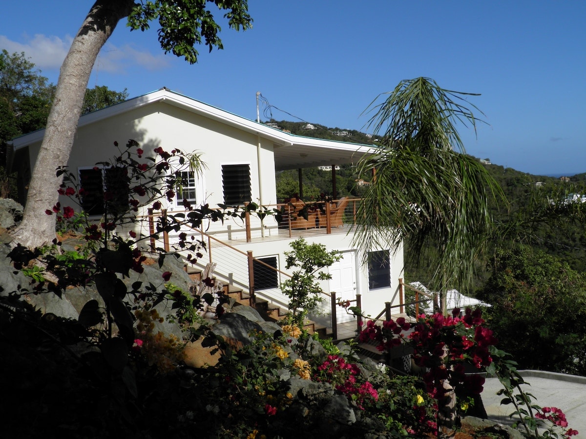 El Palacio del Amor, nombrado por su propietario original por su amor por la isla, este alquiler vacacional de 3 dormitorios (2 dormitorios más una pequeña habitación con literas) / 2 baños en Cruz Bay es perfecto para parejas, amigos o familiares que buscan una estancia cómoda en St. John. Despierta con las impresionantes vistas del mar Caribe y la vecina isla de St. Thomas. La villa está enclavada en la exuberante belleza tropical de St. John con mucha sombra y patios al aire libre. Estará rodeado de plátanos, mango y tamarindo.