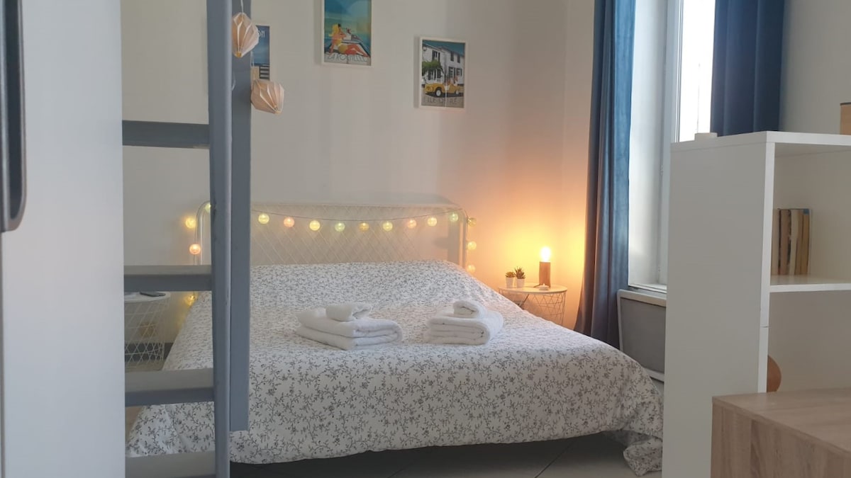 Situado en una residencia segura y tranquila en una pequeña plaza, al abrigo de las miradas y del paso, fiestas prohibidas.( guarda en el lugar ). Encantador estudio de 24 m2 optimizado y reformado (2023) con aspecto de un gran será el garante de sus vacaciones exitosas en el centro de la ciudad de La Rochelle. al pie del mercado central, descubrirá a pie el puerto viejo, sus calles empedradas, el casco antiguo, estación de tren a 10 minutos a pie Opcionalmente GARAJE SEGURO a 50 metros de la residencia. WIFI con FIBRA y paquete de TV