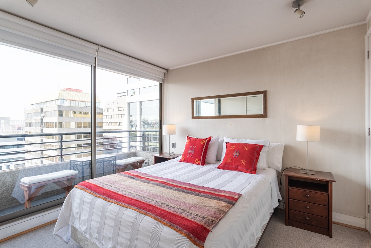 68 metros cuadrados de sofisticada comodidad!. dos amplios dormitorios, cada uno con cama king, smart TV full HD. Super wifi 800 mpps. (y además router móvil para emergencias) Estacionamiento incluido dentro del edificio sin costo. A 6 cuadras del Costanera Center. Puedes caminar al Metro. Conserje 24 horas. Seguridad total. Casas de cambio, cafés, restoranes. Linda vista desde el piso 10 y piscina en verano. Sofa cama extra, para dos. (Cuna y sillita a pedido para niño/bebé).