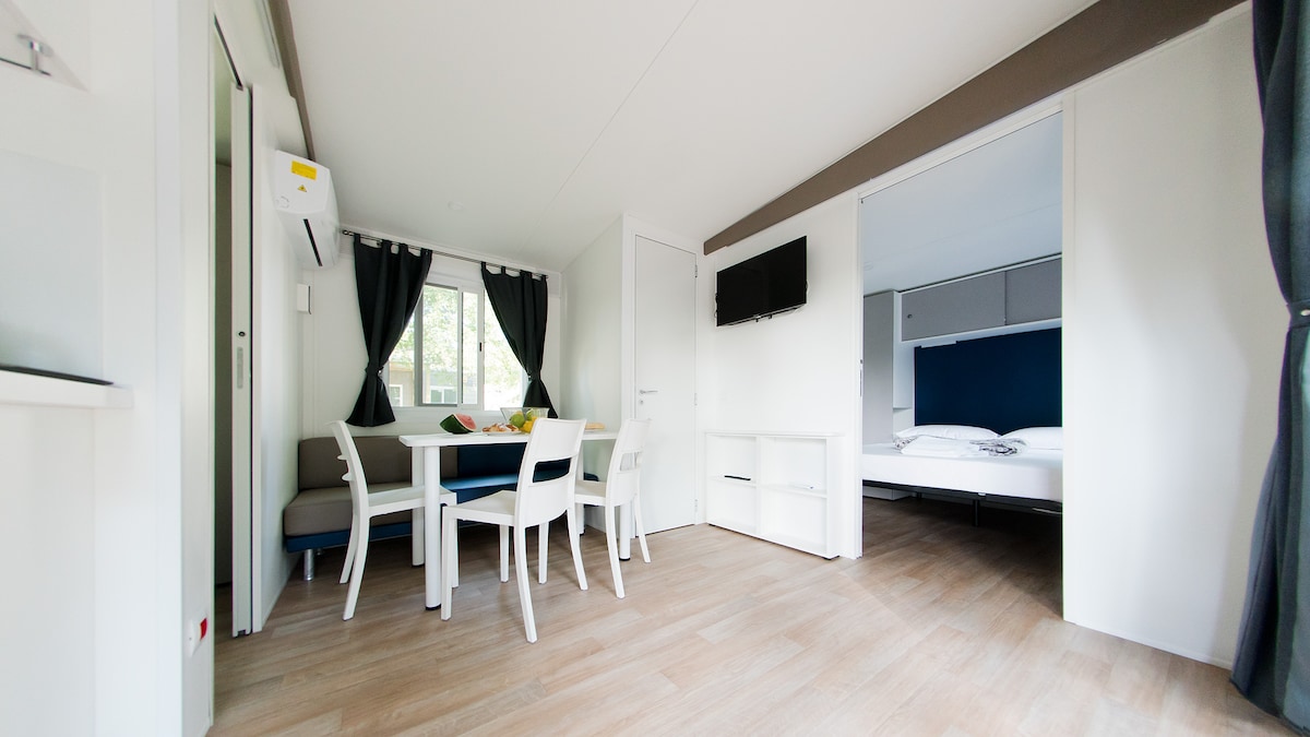 Superficie: 24 m² + amplia terraza de madera, se admiten mascotas previa solicitud en algunas unidades, 2 dormitorios: uno doble y otro con 2 camas individuales + 1 cama alta, sala de estar con sofá, cocina pequeña equipada con microondas, nevera y congelador, 2 baños con ducha, lavabo e inodoro (sin secador de pelo), aire acondicionado / calefacción, TV, terraza con mesa y sillas de jardín