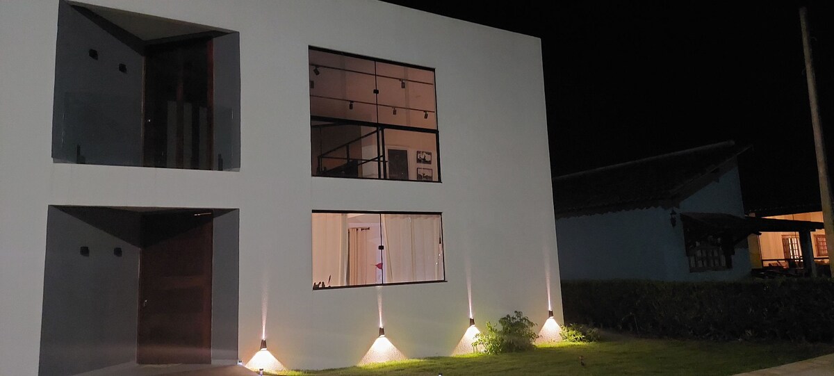 Este es el lugar perfecto para relajarse con toda la familia y amigos, en una casa ubicada en lo alto y totalmente integrada con la naturaleza y la Mata Atlántica. Una típica casa de campo, tranquila, con una decoración cálida, con vistas a las luces de la ciudad. Y, además, un lugar lleno de arte. AHORA CON CALEFACCIÓN DE LA PISCINA INFANTIL