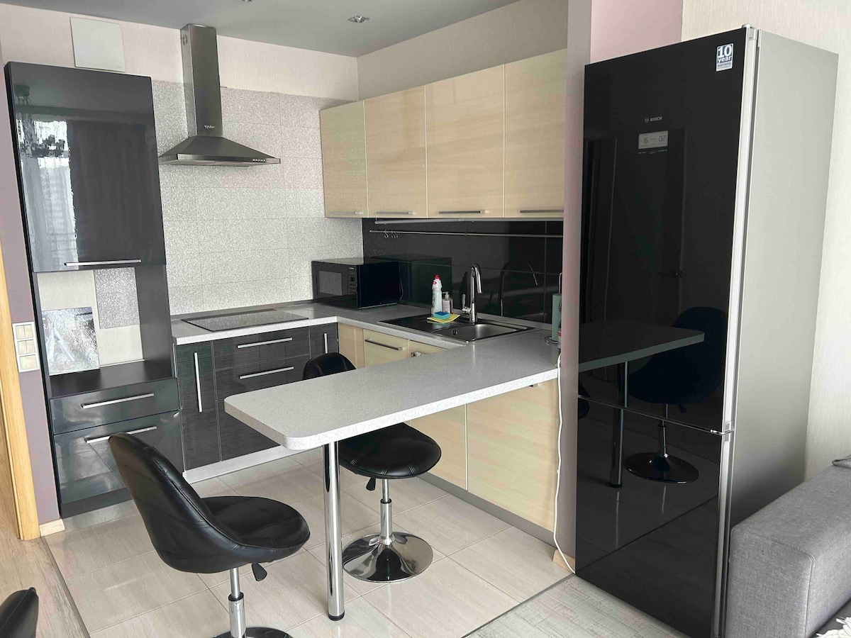 Apartamento nuevo, espacioso, acogedor y muy elegante (LOFT). El apartamento tiene 2 camas de matrimonio y un sofá cama. Casa nueva, aparcamiento gratuito vigilado, parque infantil, estadio. El apartamento está equipado con todos los electrodomésticos necesarios para una estancia cómoda: aire acondicionado, microondas, cocina, horno, lavadora, secador de pelo, plancha, televisores.
