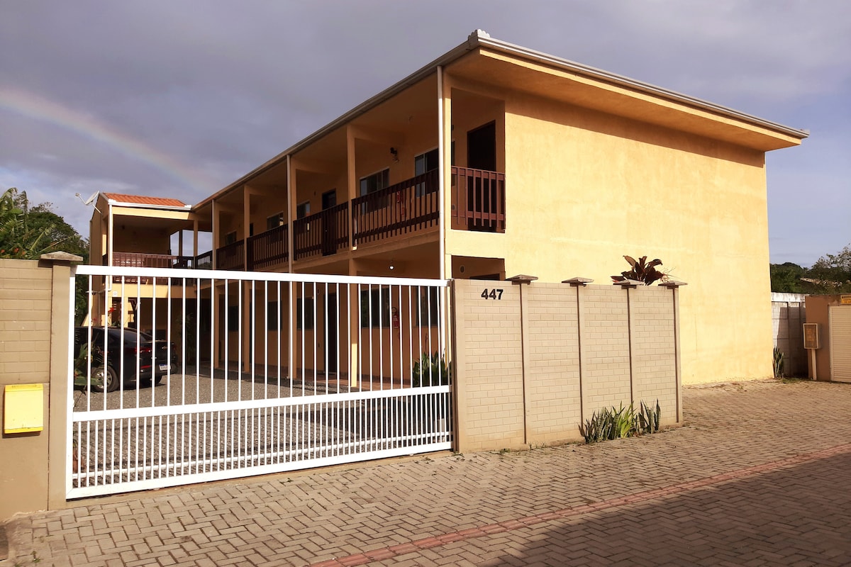 Estudio Lindo para un máximo de 4 personas, padres e hijos. Cocina completa (estufa, nevera y microondas), utensilios básicos, vistas al mar, cama de matrimonio, sofá cama, baño con jacuzzi climatizado. Tenemos wifi, aire acondicionado y televisión. La propiedad tiene jardín, parrillas y piscina (colectiva) Está en una región tranquila. Estamos cerca de las playas: Sepultura, Lagoinha y Retiro dos Padres (5 min a pie). Y estamos a unos 15 minutos caminando desde el Centro Bombinhas. Una plaza de aparcamiento gratuita.