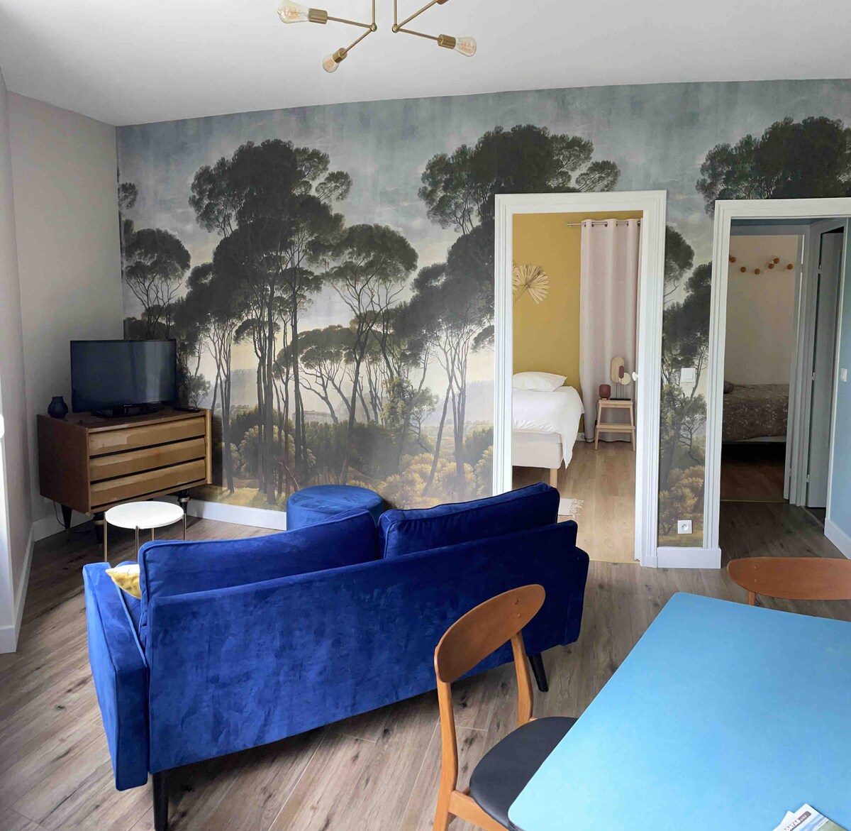 «Una noche bajo las estrellas», un momento suspendido donde el tiempo parece detenerse. Este encantador apartamento ubicado bajo los tejados y bañado de luz suave le da la bienvenida con su sala de estar con sofá vintage y sus cojines, propicio para la relajación. Por la noche, basta con levantar la vista para admirar el cielo estrellado. La habitación abuhardillada, íntima y luminosa, prolonga este ambiente romántico. La madera y la luz tamizada recuerdan la suavidad de un refugio donde cada momento está impregnado de encanto y magia.
