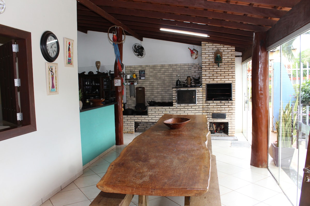 Casa rústica com cozinha aberta em meio a dois pequenos bosques de cerrado. Muita natureza para descanso, totalmente privativo. Area para fogueira. A casa conta com uma suíte grande com cama queen. Banheira de imersão. Quarto anexo à suíte com 3 camas de solteiro. Um lavabo externo. Refeições sob encomenda com parceiros. Parceria tbm com guia de turismo. Estamos a 8 minutos de carro do centro da cidade (praça dos festivais).