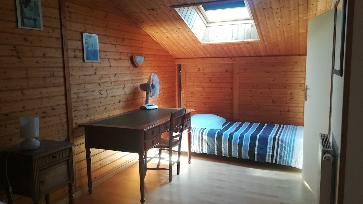 Habitación en casa particular, a 7 minutos de la Arena, a 200 metros de todas las tiendas, (panadería, supermercado, bar tabaquería, pizzería, restaurante, farmacia), a 300 metros de los pantanos para paseos, a 4 km del mar, a 9 km de Les Sables d'Olonne. La habitación incluye una zona de dormitorio, un baño con inodoro y ducha privados, una zona de estar con escritorio, hervidor de agua y tazas para el descanso del té. Entrada independiente, pequeña terraza con mesa y sillas, y tumbonas, vajilla disponible si es necesario.