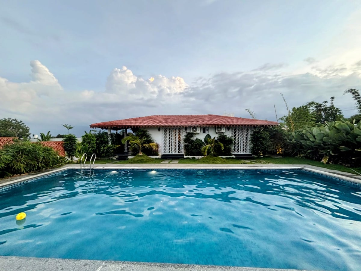 Cerca de Hyderabad, te espera una encantadora cabaña de madera en medio de un exuberante refugio de árboles de mango. Disfruta de la tranquilidad mientras te refrescas en tu piscina privada, rodeado del aroma dulce de las flores de mango. Los días se pasan paseando por el huerto, recogiendo fruta madura, mientras que las noches te invitan a relajarte en la terraza, escuchando la sinfonía de la naturaleza. Una fusión perfecta de naturaleza y comodidad, esta cabaña es un oasis de serenidad justo más allá del bullicio de la ciudad.