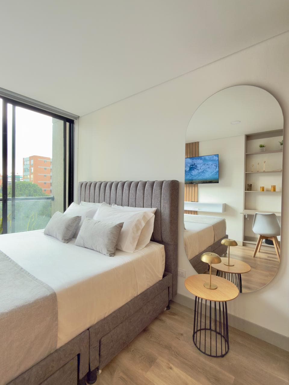 Disfruta de un loft premium en el corazón de Chicó Un espacio moderno de 27 m² con balcón privado, cama de lujo, sábanas extra suaves, cortinas motorizadas, espejo con Bluetooth y luces LED de última tecnología. Ideal para estadías largas: cuenta con escritorio ergonómico, WiFi 5G y Smart TV con Netflix, Disney+ y Prime Video. Incluye lavadora propia y opción de limpieza semanal con cambio de lencería. Vive Bogotá con estilo y confort.