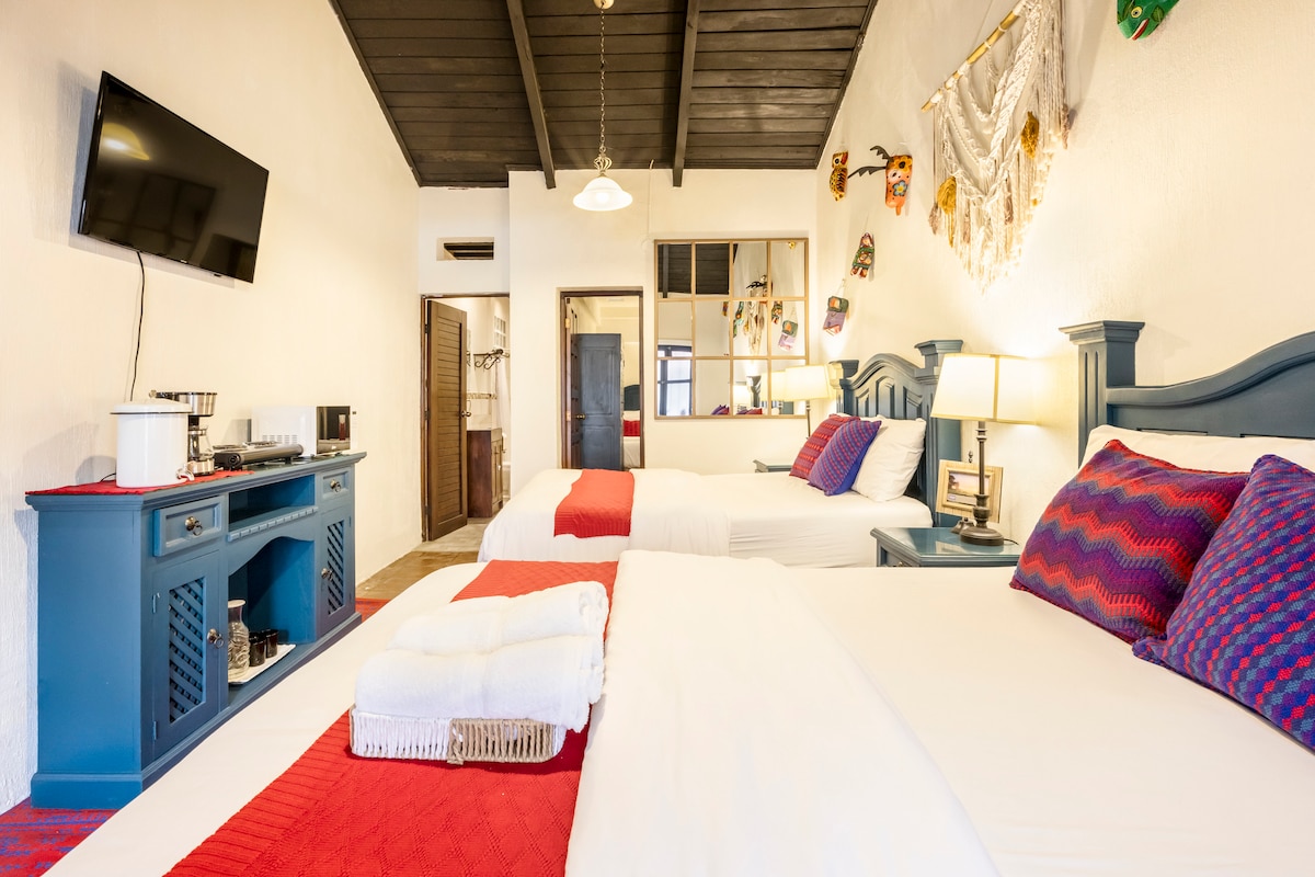 Amplia y cómoda habitación en El Carmen Hotel ubicado en el centro de la ciudad a solo 1.5 cuadras del parque central. Cuenta con dos camas matrimoniales, tv cable, wifi, aire acondicionado, baño privado, artículos de tocador y acceso a nuestro rooftop con vistas espectaculares de Antigua. Disfrute de nuestro famoso desayuno incluido y parqueo gratuito en su reserva. *DEBIDO A QUE SE TRATA DE UN HOTEL SE LE ASIGNARÁ CUALQUIERA DE LAS HABITACIONES EN LAS IMÁGENES*