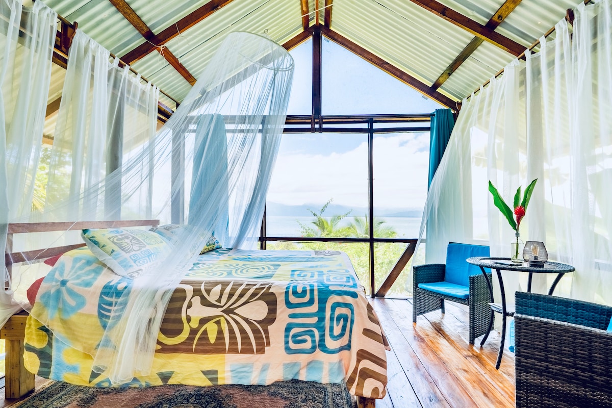Vea las vistas de las montañas más altas de toda la Gran Bahía de Chiriquí en Panamá. Esto le ofrece unas fantásticas fotografías. Aquí se encuentra el romántico "Nativo Lodge Suite" con techo de paja, totalmente cerrada con mampara, una cómoda cama tamaño queen, baño con ducha al aire libre y refrigerador. Los atardeceres panorámicos se disfrutarán en su patio privado con jacuzzi, brasero y columpio. Comparta este entorno espectacular con tucanes y perezosos, un entorno único y muy privado.