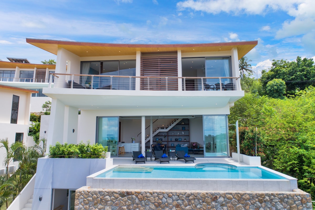 ***Update: For longer- term stays in October and November, please send us a request. Discover serene island luxury in our contemporary 3-bed pool-villa nestled between Samui's top hotels, Six Senses and Ritz Carlton. Enjoy breathtaking sea views and sunsets, just a 5-7 minute stroll to two semi-private beaches. Perfect for couples, friends, and families seeking an exclusive home blending island-life with comfort.
